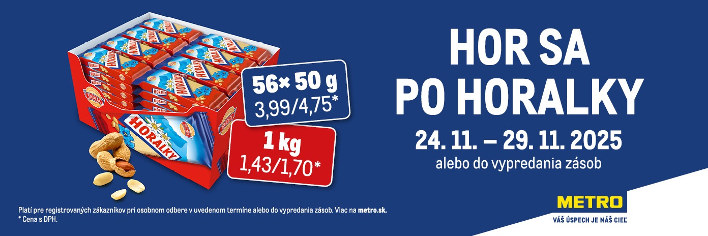 Akcia platí pre registrovaných zákazníkov pri osobnom odbere vo veľkoobchodných strediskách METRO Cash & Carry SR v uvedenom termíne alebo do vypredania zásob. Podmienkou pre získanie odmeny je splnenie nákupného limitu 599 € s DPH pre odmenu 1 balenie 56 x Horalky 50 g, za jedinečnú cenu 4,75 € s DPH. Nákup nie je možné rozdeliť na viac faktúr a na jednu registráciu je možné získať max. 1 balenie za zvýhodnenú cenu. Do hodnoty nákupného limitu sa nezapočítava nákup pohonných hmôt, tabakových výrobkov, vratných obalov a nákup zložený prevažne z liehovín. Túto jedinečnú ponuku získate iba vo veľkoobchodnom stredisku, v ktorom uskutočníte svoj nákup. Pri vyzdvihovaní zľavového produktu – 56 x Horalky 50 g – sa preukážte faktúrou s nablokovaným zľavovým produktom.