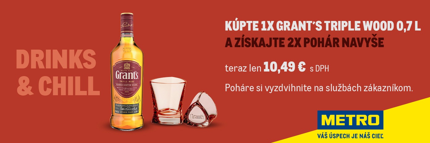 Využite od 18. do 21. 12. 2025 špeciálnu ponuku na Whisky Grant´s Triple wood 700 ml s dvoma pohármi za cenu iba 10,49 € s DPH, cena za 1 l je 14,99 € s DPH. Akciová ponuka je určená pre registrovaných zákazníkov pri osobnom nákupe vo veľkoobchodných strediskách METRO Cash & Carry SR s.r.o. do vypredania zásob. Poháre si, prosím, vyzdvihnite na recepcii služieb zákazníkom po zakúpení.
