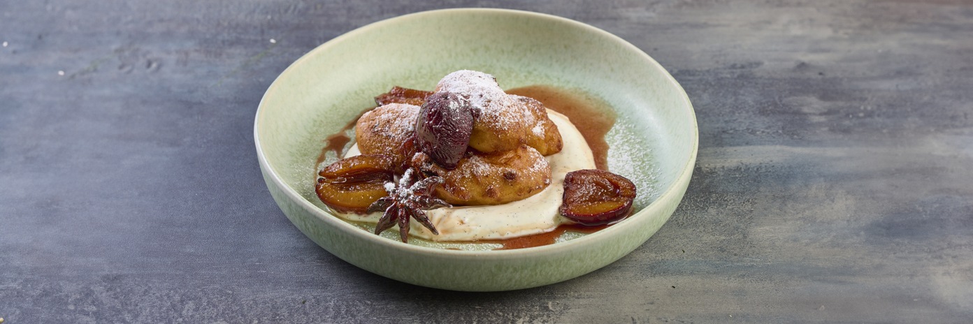 Na tanier dáme ochutenú smotanu, na ňu naukladáme šišky, dozdobíme flambovanými slivkami a môžeme servírovať.