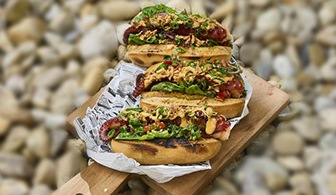 Octodog, petržlenová salsa s paradajkami, dresing a smažená cibuľka