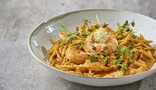 Krémová tarhoňa s maslovou tekvicou, mortadellou, slaninou, pecorinom a krevetami