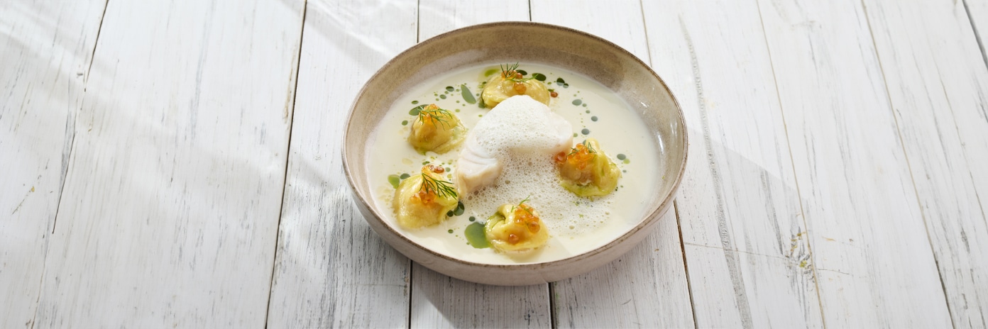 Pošírovaná treska skrei, domáce cestoviny s kaviárom a napenená omáčka z bieleho vína a smotany