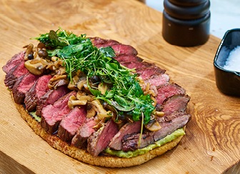 Bruschetta s grilovaným hovädzím steakom, guacamole, restovanými hubami a mikrošalátom