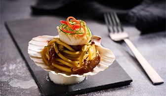 Mušle sv. Jakuba s rezancami a hubami Shii-take