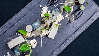 Údený sumec s karfiolom, chrenom, čiernym koreňom a lúčnym senom